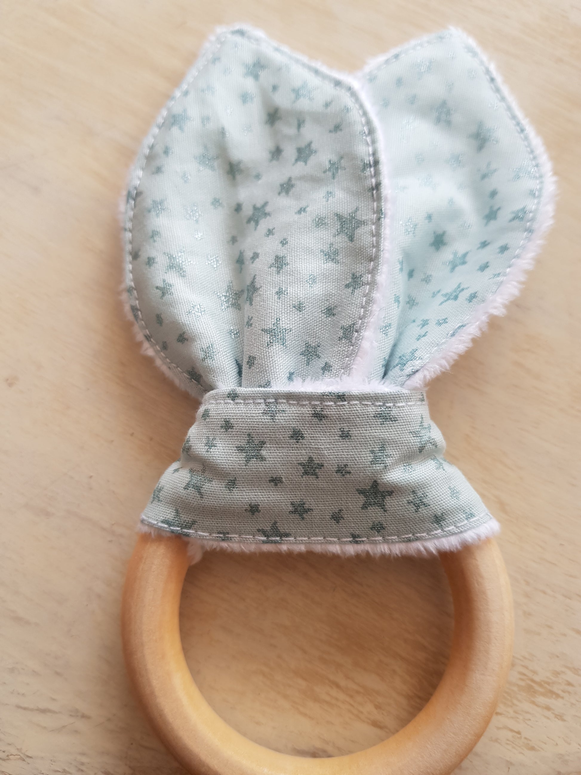 L'anneau est en bois non traité, essence naturelle de bois hêtre, les oreilles sont en coton, jersey, minky, double gaze et toujours une face en éponge de bambou.