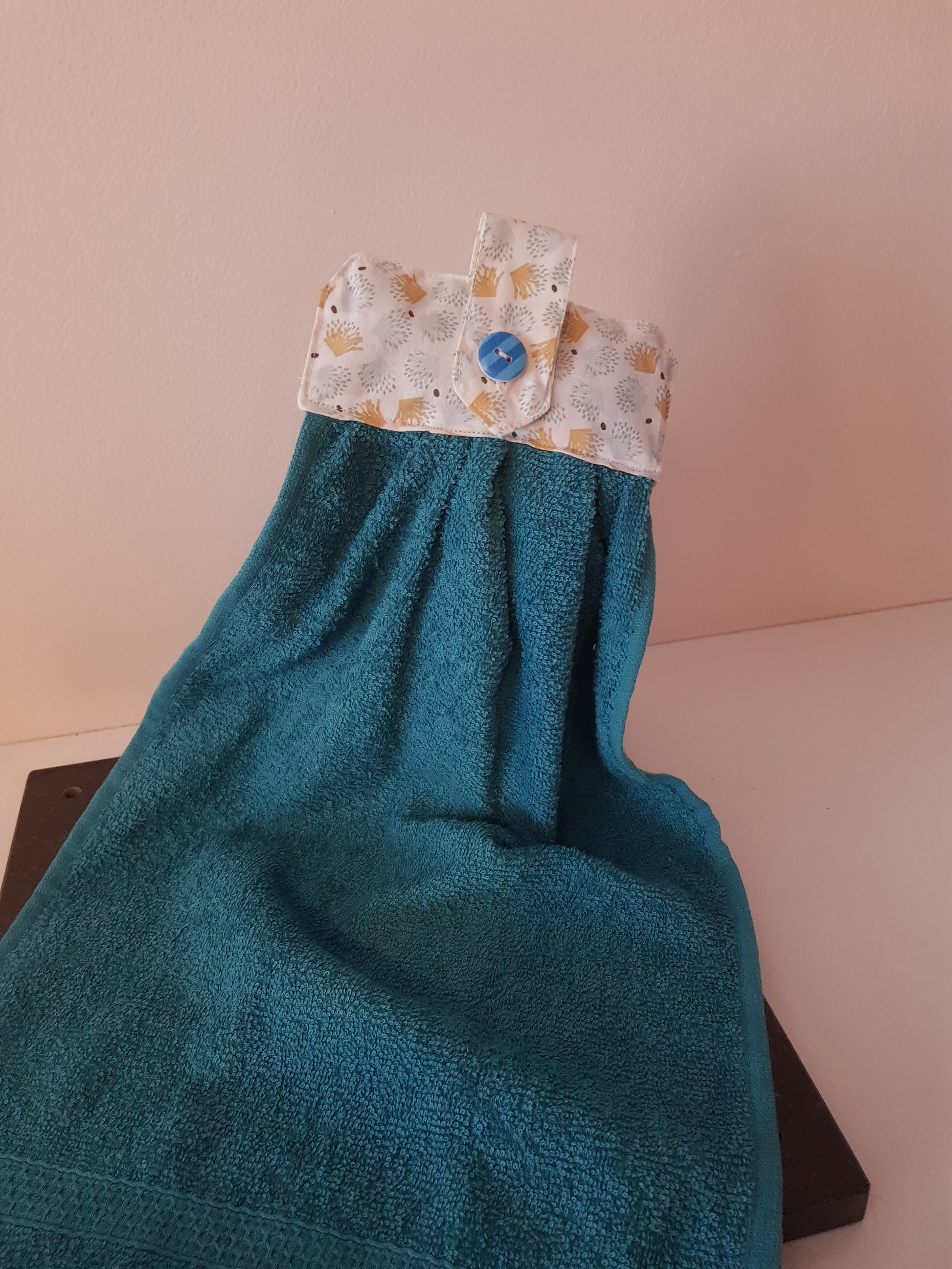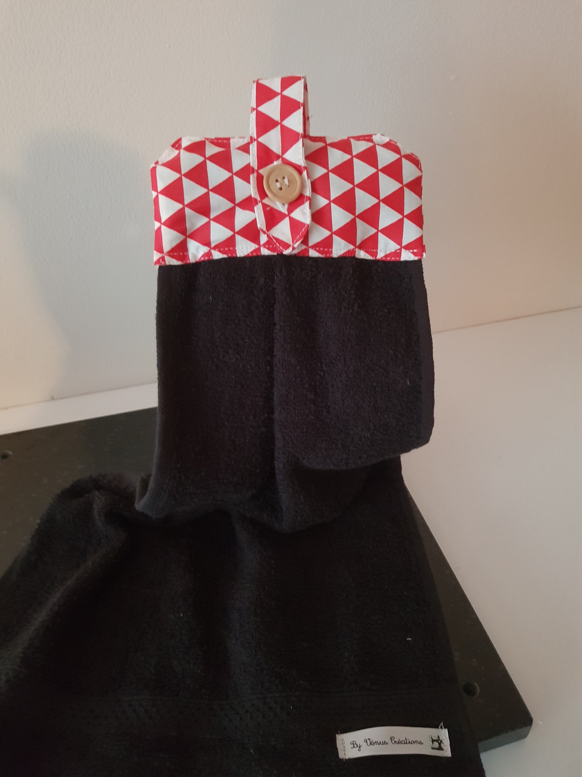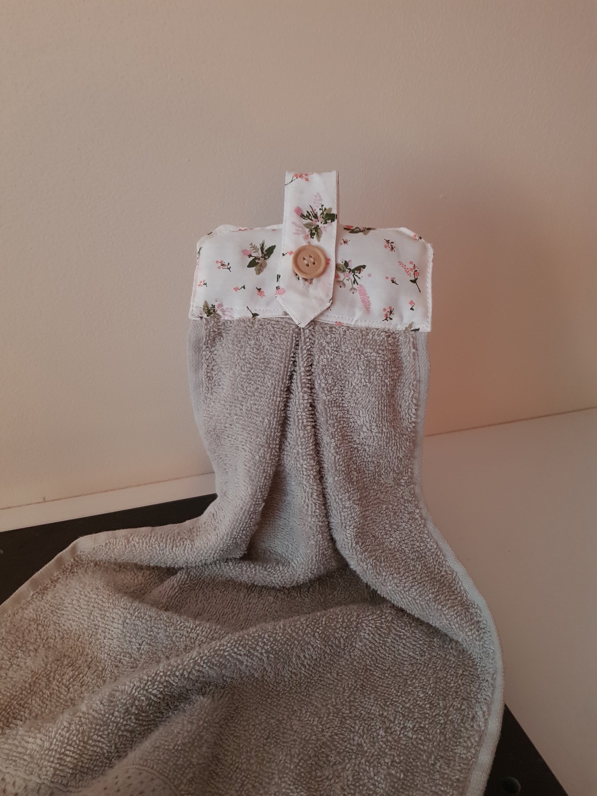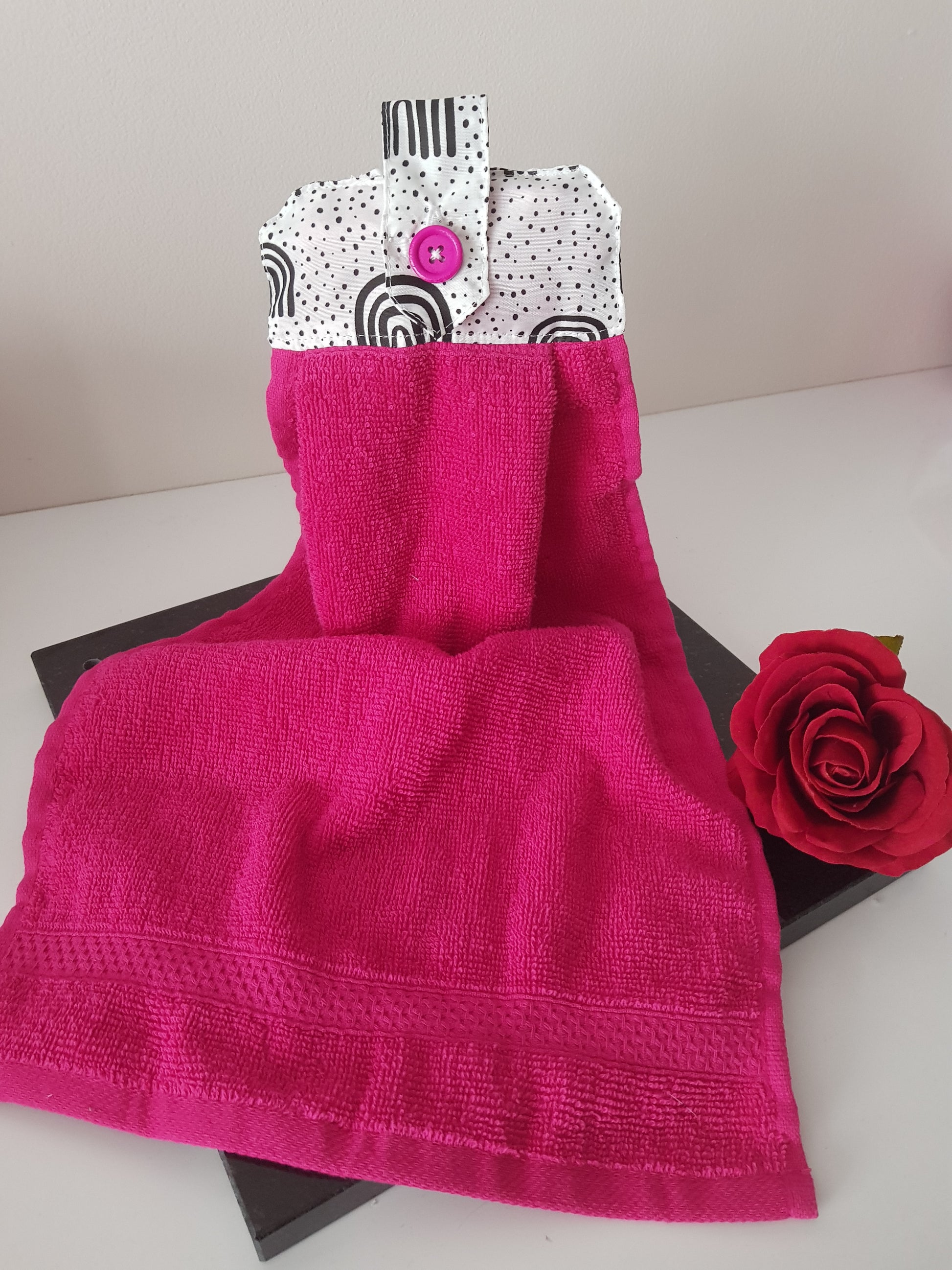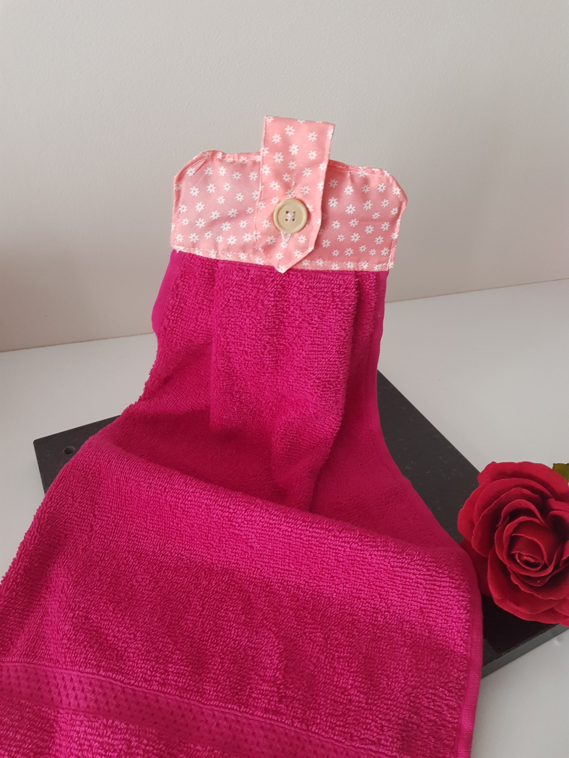 Un joli essuis main qui peut s'accrocher partout, à la poignée d'une porte, à la barre inox de votre cuisine le porte serviette de votre salle de bain et bien d'autre endroit encore.