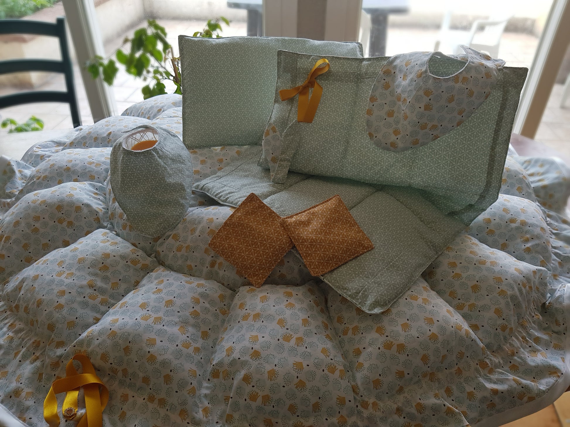 L'ensemble est conçu et créer au couleur que le client aura choisi. Pour se faire nous contacter par email ou par téléphone pour établir le devis, le bon de commande et choisir ensemble les tissus et thèmes.